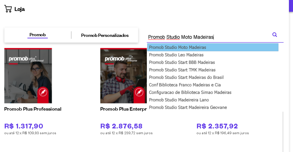 Na barra de pesquisa na direita pesquise por Promob Studio Moto Madeiras