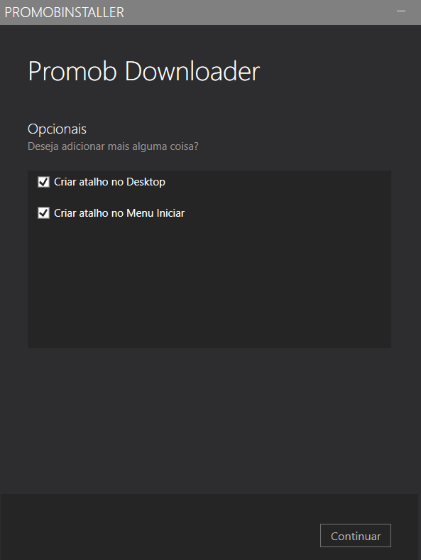 Aguarde enquanto o Promob Downloader é instalado. Após, escolha as opções de atalho do Promob Downloader e clique em Avançar;